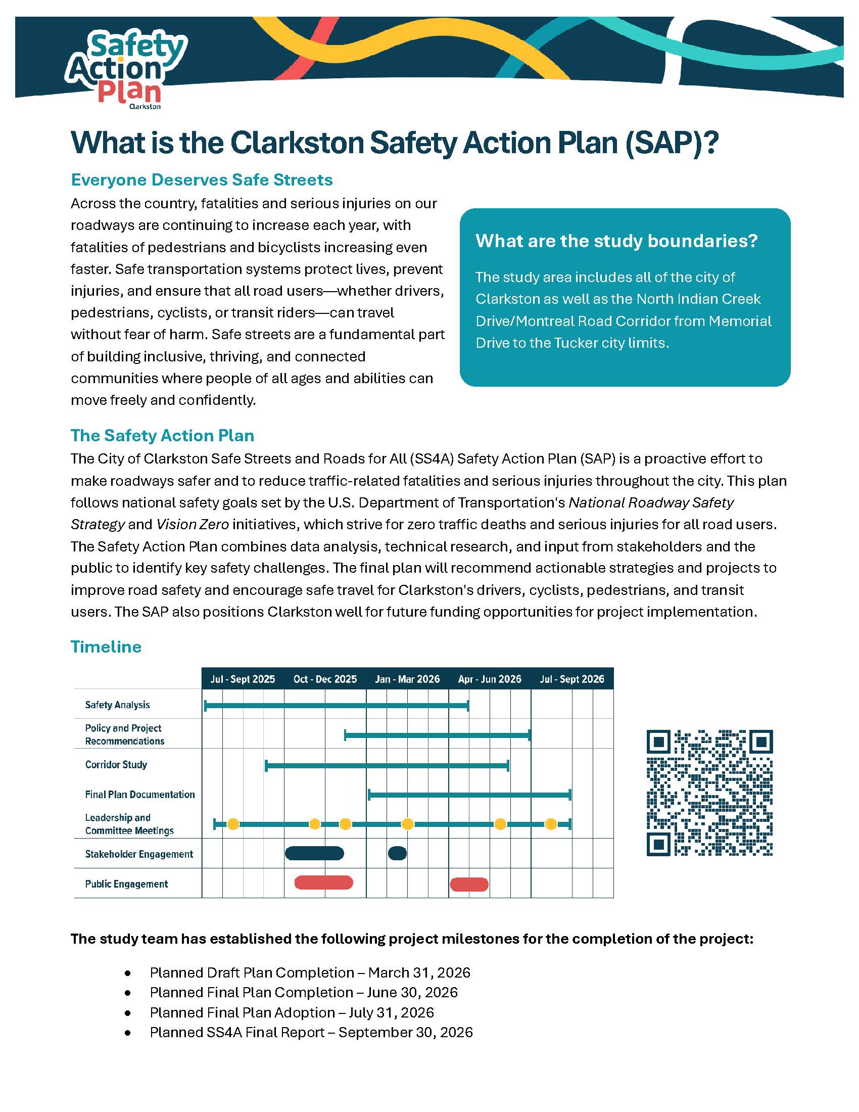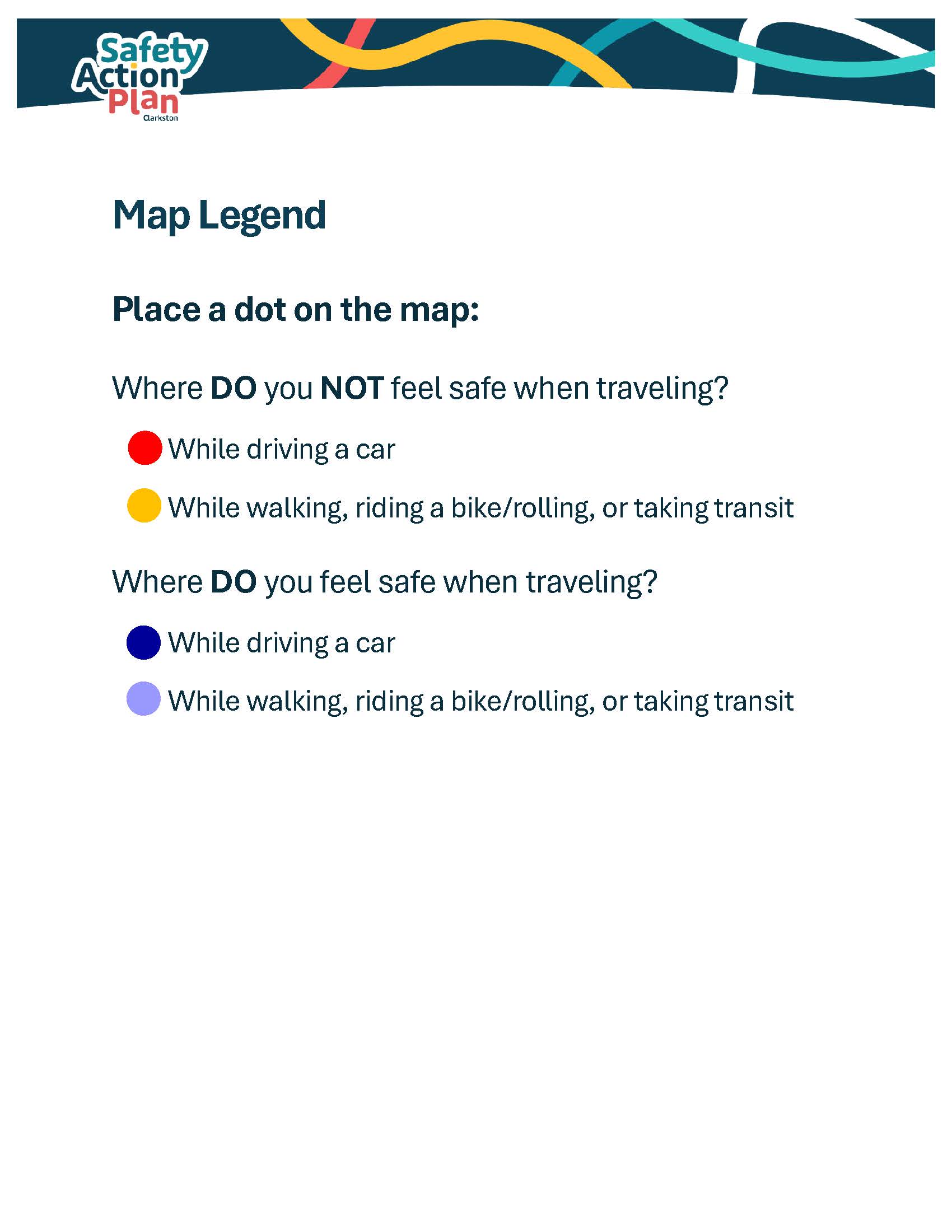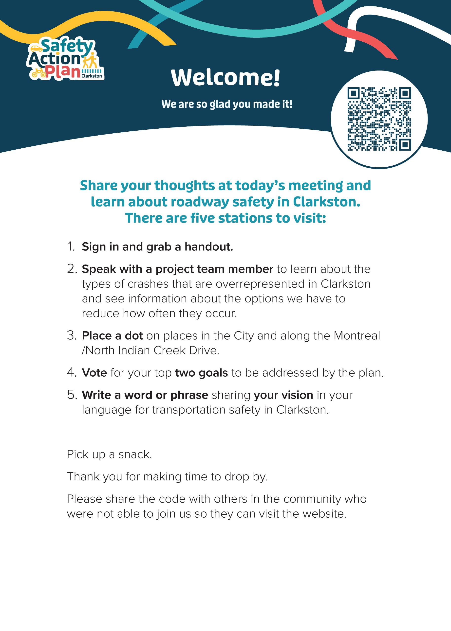 Welcome to the online version of the Clarkston Safety Action Plan Public Open House! Browse through or download the meeting presentation boards and feedback activities, then leave your feedback on the vision and goals of the Safety Action Plan. Finally, drop a pin and leave a comment on the interactive map to let us know where you don't- and do- feel safe traveling through Clarkston and along Montreal Road/North Indian Creek Drive.