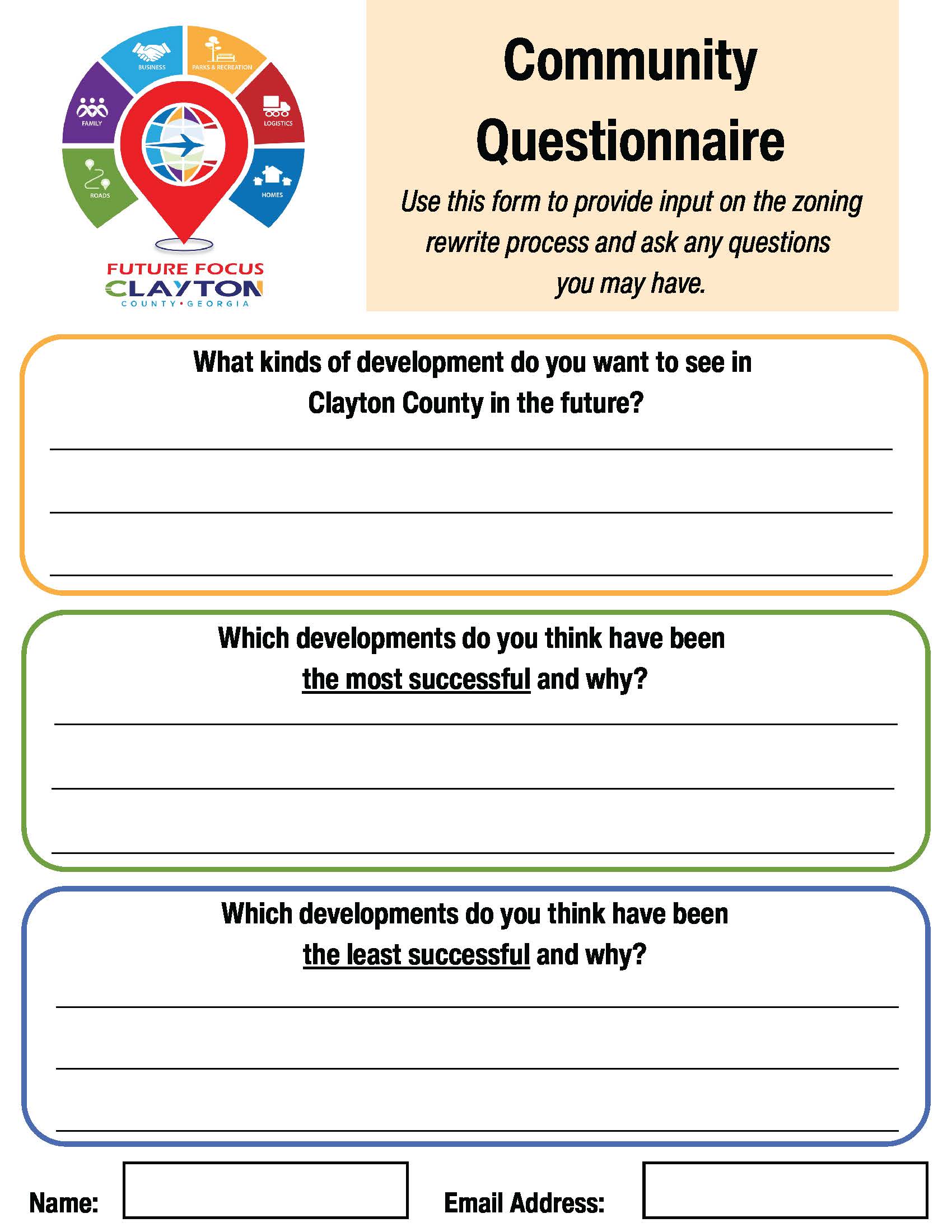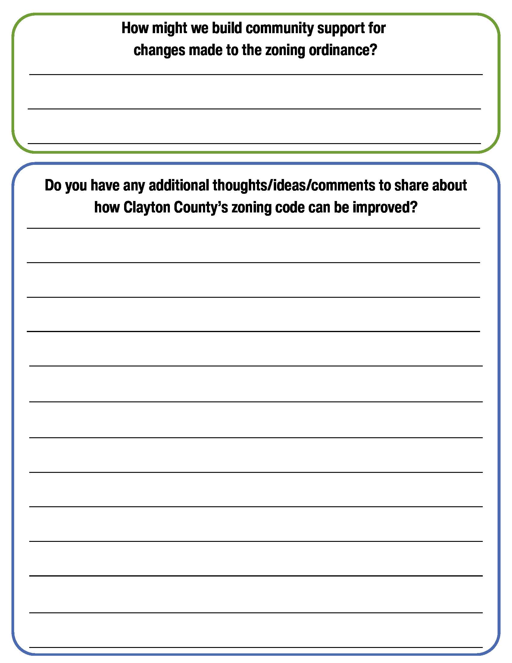 Hearing from people on their firsthand experiences is critical to understanding the how current zoning impacts Clayton County residents and community stakeholders: What is working well? What are the opportunities for improvements? What are the challenges to overcome? Alongside technical analyses of the existing conditions and input from key stakeholders responsible for delivering infrastructure, policies, and programs, the updated zoning ordinance will reflect conversations with residents and business owners about their priorities for the county's direction and better align with existing/future land uses.